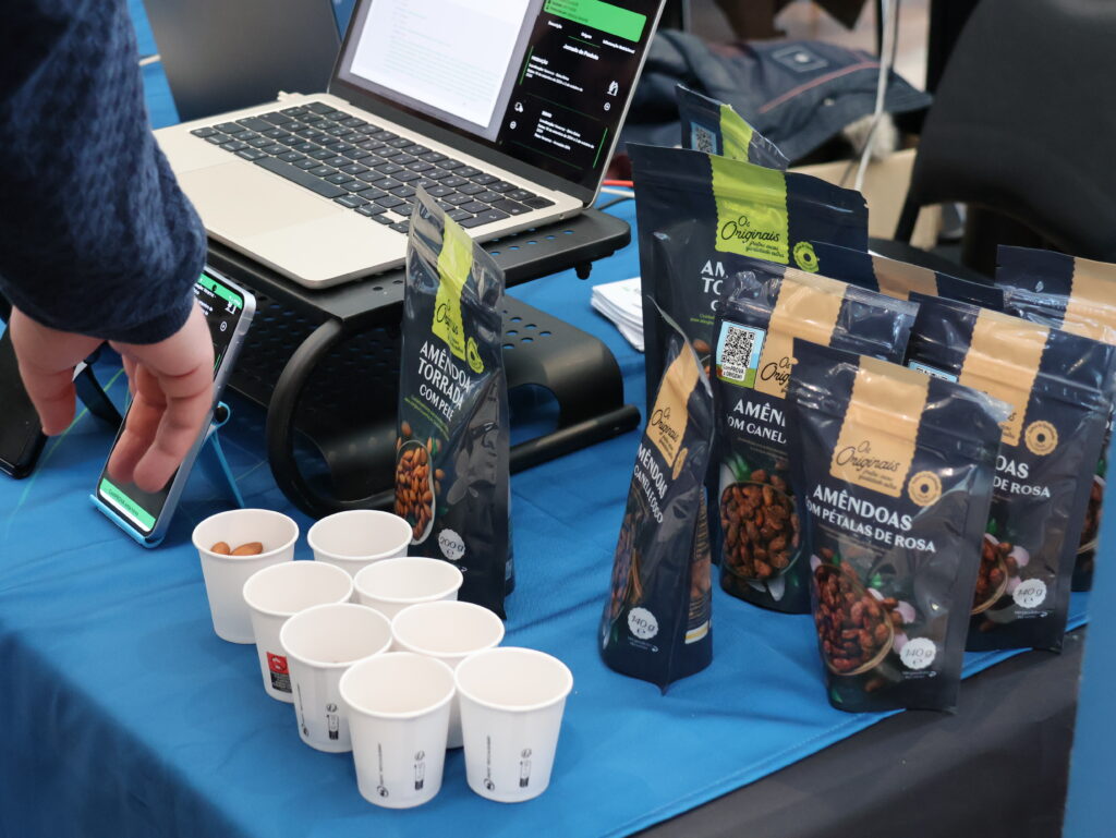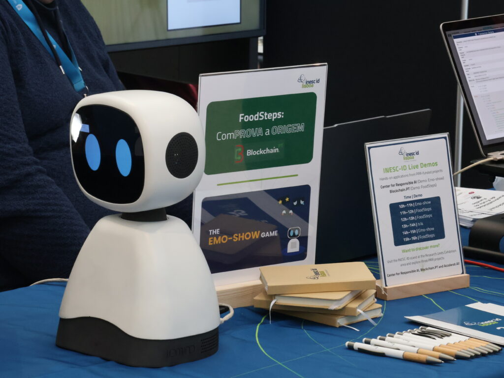 Through the wide glass doors of the Técnico Innovation Center, visitors were immediately greeted by the Innovation Arena, an array of demonstrations, carefully set up by the different research entities. At the centre, facing the stage, was our very own INESC-ID demo station and volunteer researchers with live demonstrations from two PRR projects. A familiar face rested upon the table, the robot Elmo, who is no stranger to these kinds of events, often helping participants identify edible mushrooms. This time, however, he represented CRAI, which is developing fairer, more transparent and sustainable AI products. His adorable facial expressions were employed in a game called “the Emo-show”, designed to detect, interpret and respond to human behaviours in real time. Next to this demo was another well-known PRR project, Blockchain.PT, which, considering the season, brought almonds instead of the usual cherries to demonstrate how blockchain technology can trace the origins of food products from “farm-to-fork”, for more transparency and reliability in the agri-food sector.